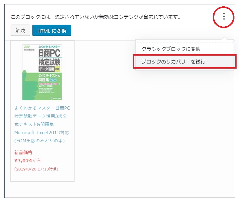 「三点つぶつぶ」のボタンから、「ブロックのリカバリーを試行」をクリック